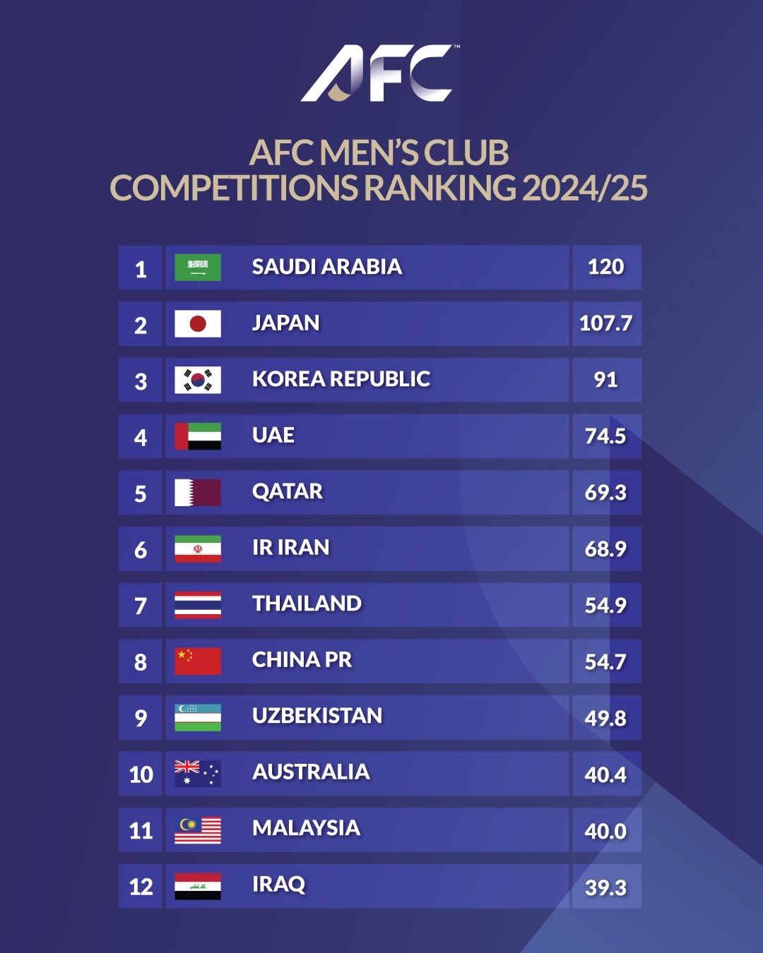 今年5月份,亚足联公布2024/25赛季各协会联赛积分排名,当时中超以54.682分排在亚洲第8,落后泰超对手0.2分。因此从下赛季、也就是26/27赛季开始,中超的亚冠席位从“2+1+1”(2个亚冠精英直通+1个精英附加赛+1个亚冠二级直通)降为“1+1+1”(1个亚冠精英直通+1个精英附加赛+1个亚冠二级直通)。