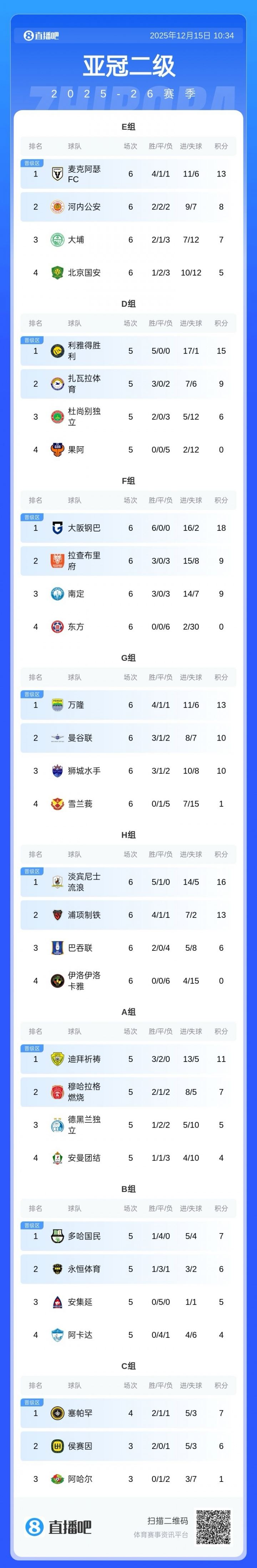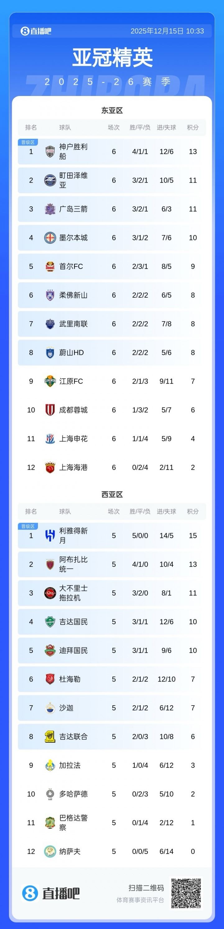 本赛季亚冠精英联赛积分榜:中超三队垫底
