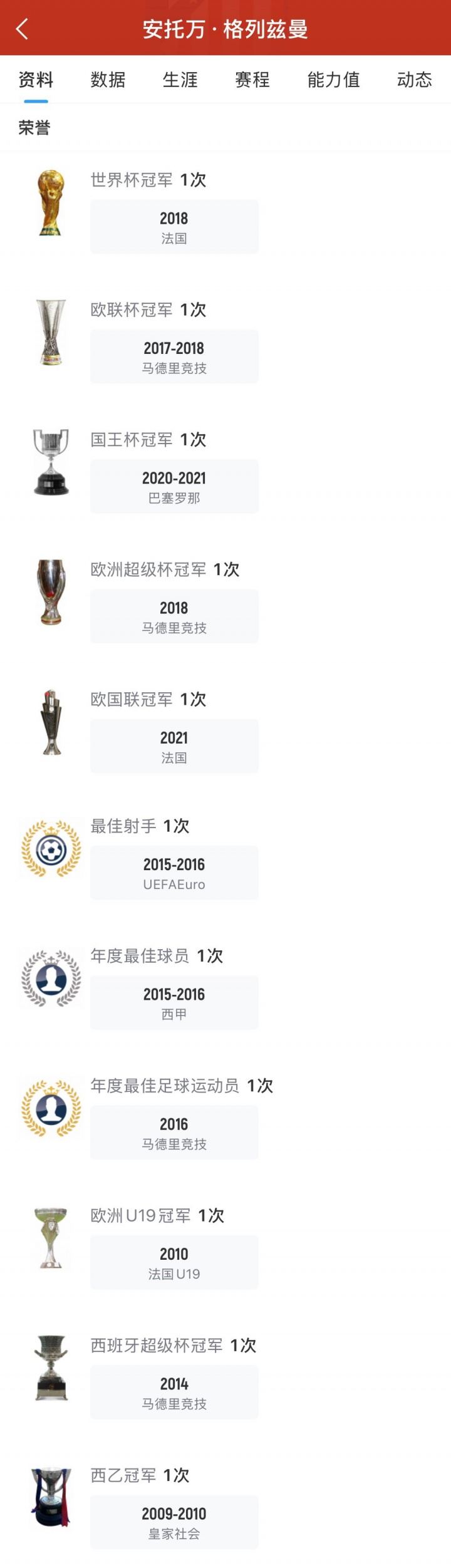 格列兹曼现年34岁,最新身价为1100万欧。在其目前的职业生涯中,还未拿到过西甲冠军或者欧冠冠军。
